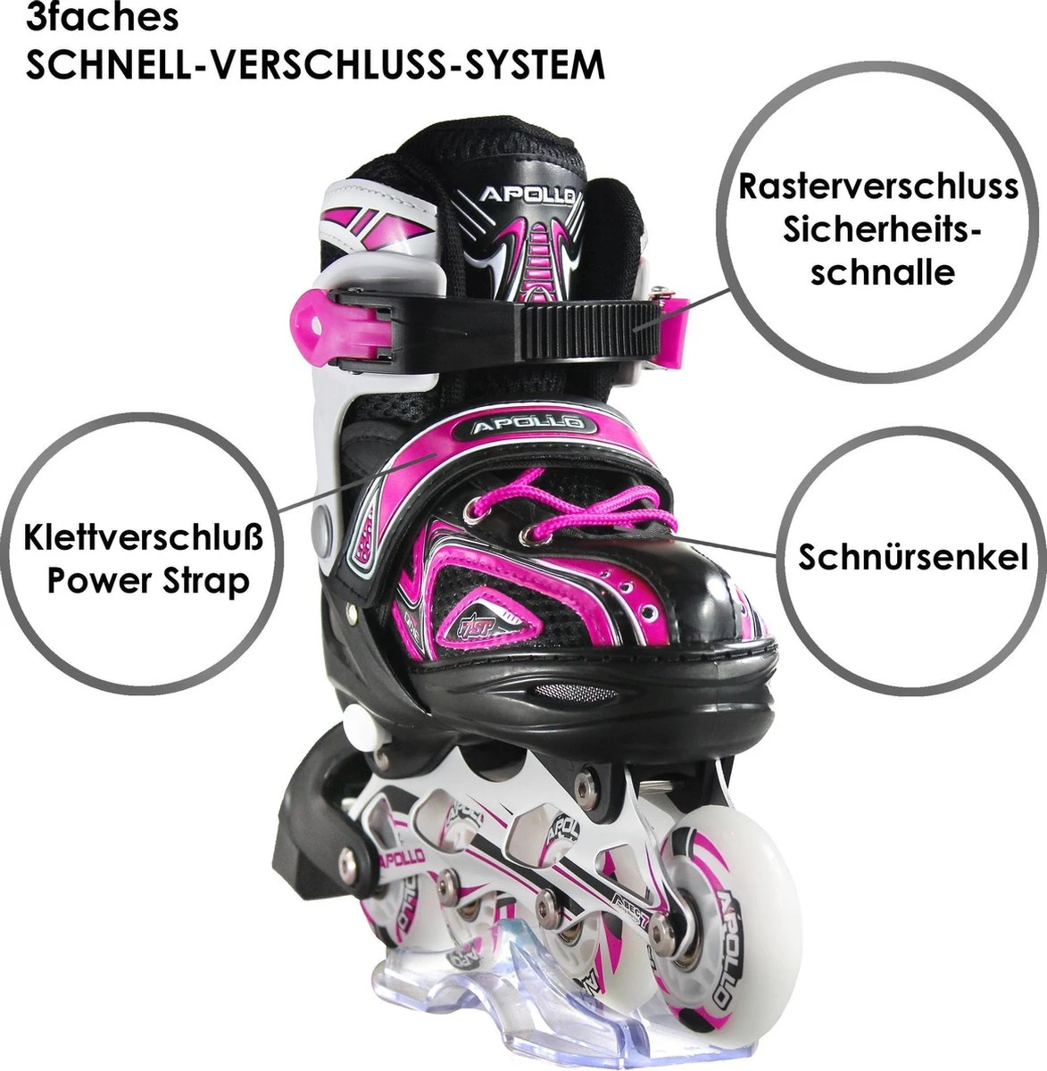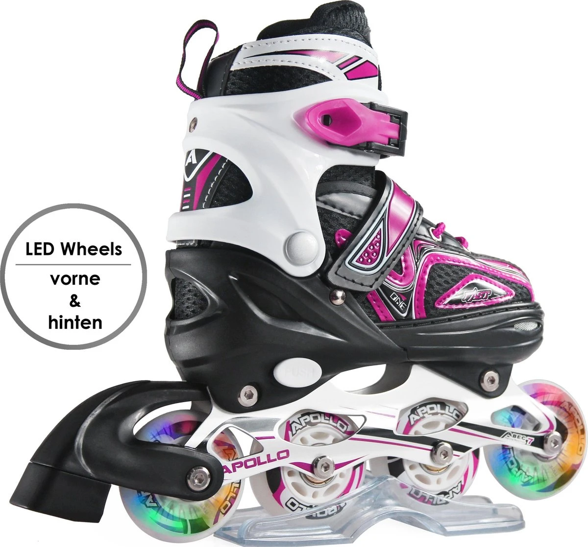 Apollo Super Blades X Pro Inlineskates De Apollo skeelers zijn perfect geschikt voor alle sportliefhebbende kinderen, tieners en volwassenen. Ideaal voor beginners en gevorderden. Maat verstelbaar: Schoengrootte 31 – 42 Lagers: ABEC 7 High Rebound wielen: Ø 70mm PU Wheels Hardheid wielen: 82A Bovenmateriaal: PU en Mesh PP hoge impact schaal en enkelband In maat verstelbaar in 4 groottes met 1 KLICK SYSTEM Met een druk op de knop is de maat met 4 groottes te verstellen, waarbij de softboot naar voren getrokken wordt. Zo zijn de skates flexibel en kunnen door uzelf op de schoenmaat worden aangepast. Ideaal voor schoenmaten van 31 tot 42 (S/M/L) Apollo Funsports Geboren in de trendy wijk, vandaag rijden onze steps, longboards, rolschaatsen en inlineskates over de hele wereld. Apollo is het professionele plezier sportmerk, met de beste materialen en een kwalitatief hoogwaardige productie voor optimale rij-eigenschappen. Wij leveren “D2C” = “Direct-to-Consumer”. U koopt dus rechtstreeks van de fabrikant. Apollo – Ride it your Way! ONZE SOCIALE BETROKKENHEID In Duitsland en op de gehele wereld zijn er veel ouders, kinderdorpen en andere faciliteiten die hun kinderen geen speelgoed zoals bijvoorbeeld longboards kunnen geven. Daarom ondersteunen wij in samenwerking met Soroptimist International Köln verschillende hulpprojecten met onze boards, speelgoed en andere producten die we kosteloos ter beschikking stellen. Apollo inlineskates zijn licht en stevig ideaal voor alle sportliefhebbende kinderen De veiligheidsgesp, Power Strap klittenbandsluiting en veters van de rolschaatsen zorgen voor een veilige grip hoogwaardige High-Rebound wielen (70mm/82A) en ABEC 7 lagers