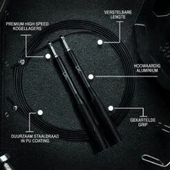 De speedrope bestaat uit een ballscrew (stalen uiteinde van handvat) en twee rvs-kogellagers. In combinatie met de 90° hoek van de kabel zorgt dit voor een hypersnelle wending. Het springtouw is hiervoor uitermate geschik om als speedrope gebruikt te worden voor bijvoorbeeld double-unders. Met een beetje oefening zijn zelfs triple-unders mogelijk!