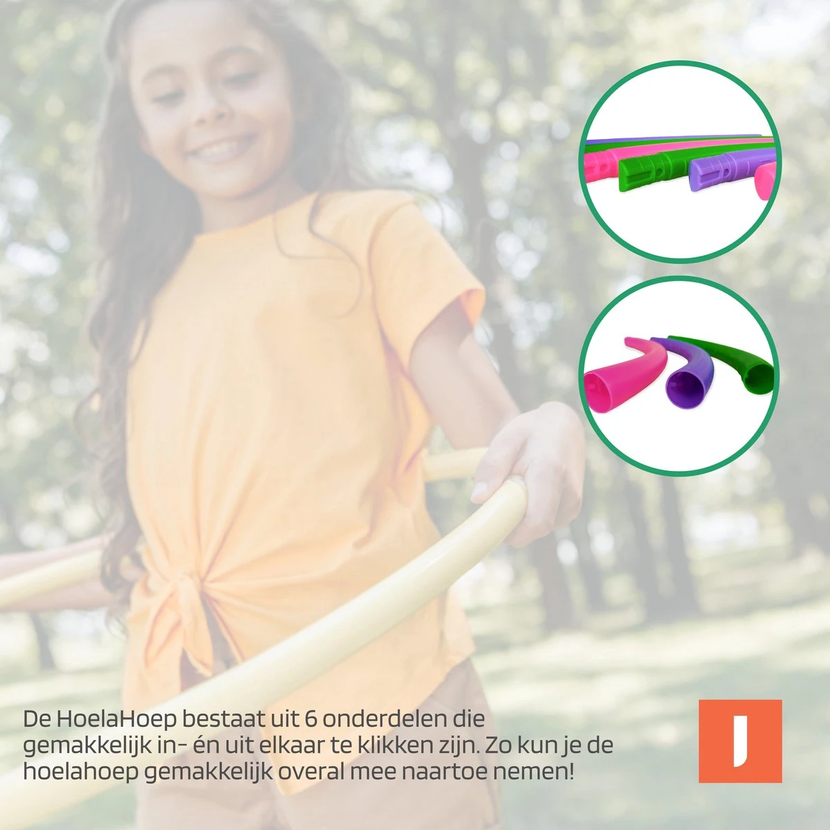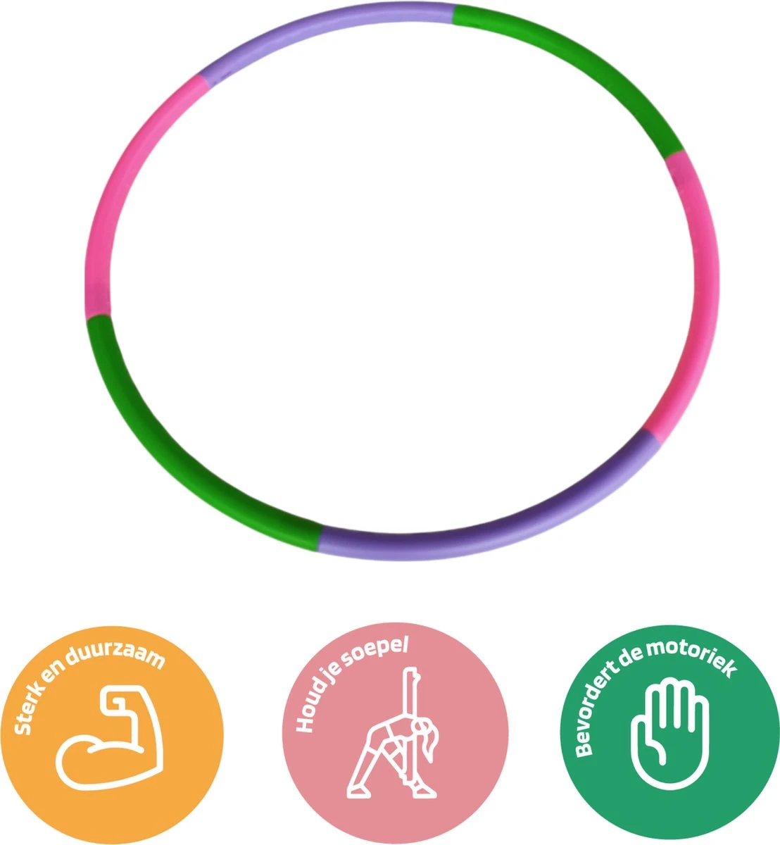 Zet deze 6-delige hoelahoop eenvoudig in elkaar en begin gelijk met hoelahoepen. De hoepel is gemaakt van hoge kwaliteit kunststof en is daardoor erg stevig. De hoepel heeft drie mooie kleuren: roze, paars en groen. Dit zorgt voor een mooi kleureffect als je hoelahoept. Daarnaast verbetert het de motoriek en coördinatie van kinderen!