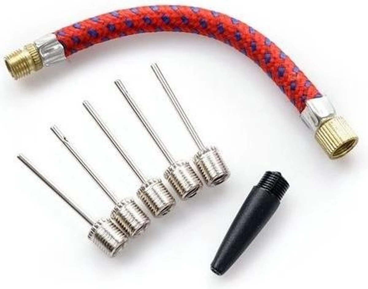 Deze aanbieding bevat 3 balnaalden, een flexibele rode slang van ongeveer 11 cm en een plastic opzet stukje voor het opblazen van een strandbal of zwembandjes. Het schoefdraad van het opdraai stik is 8 mm.