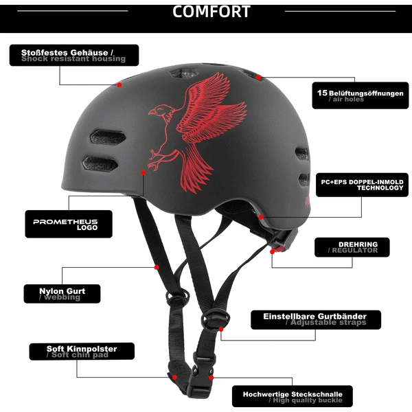 - Dankzij de voorzieningen blijft de helm stevig op het hoofd zitten en altijd in de juiste positie.