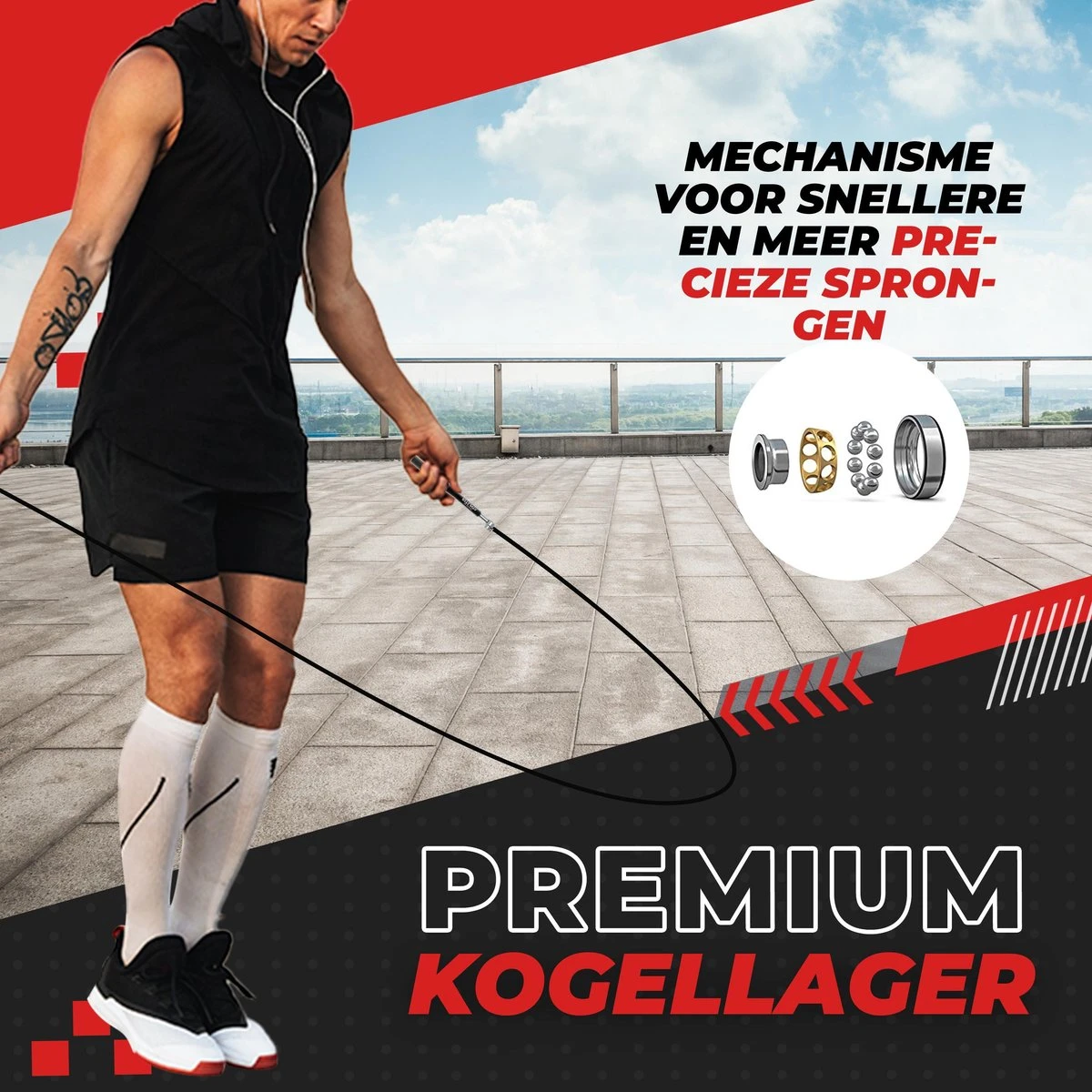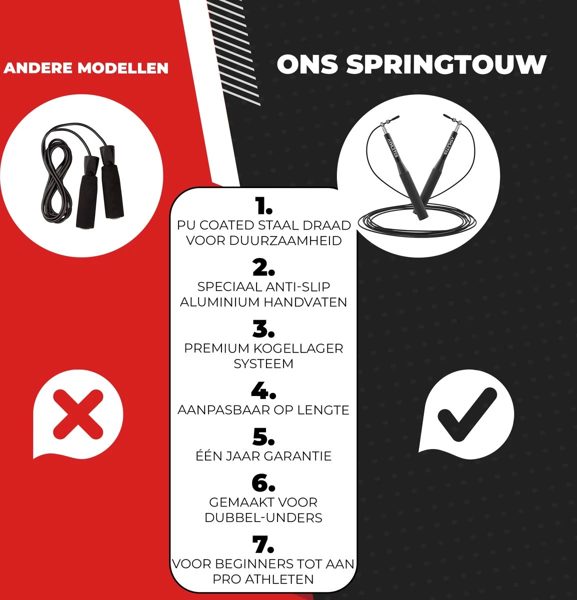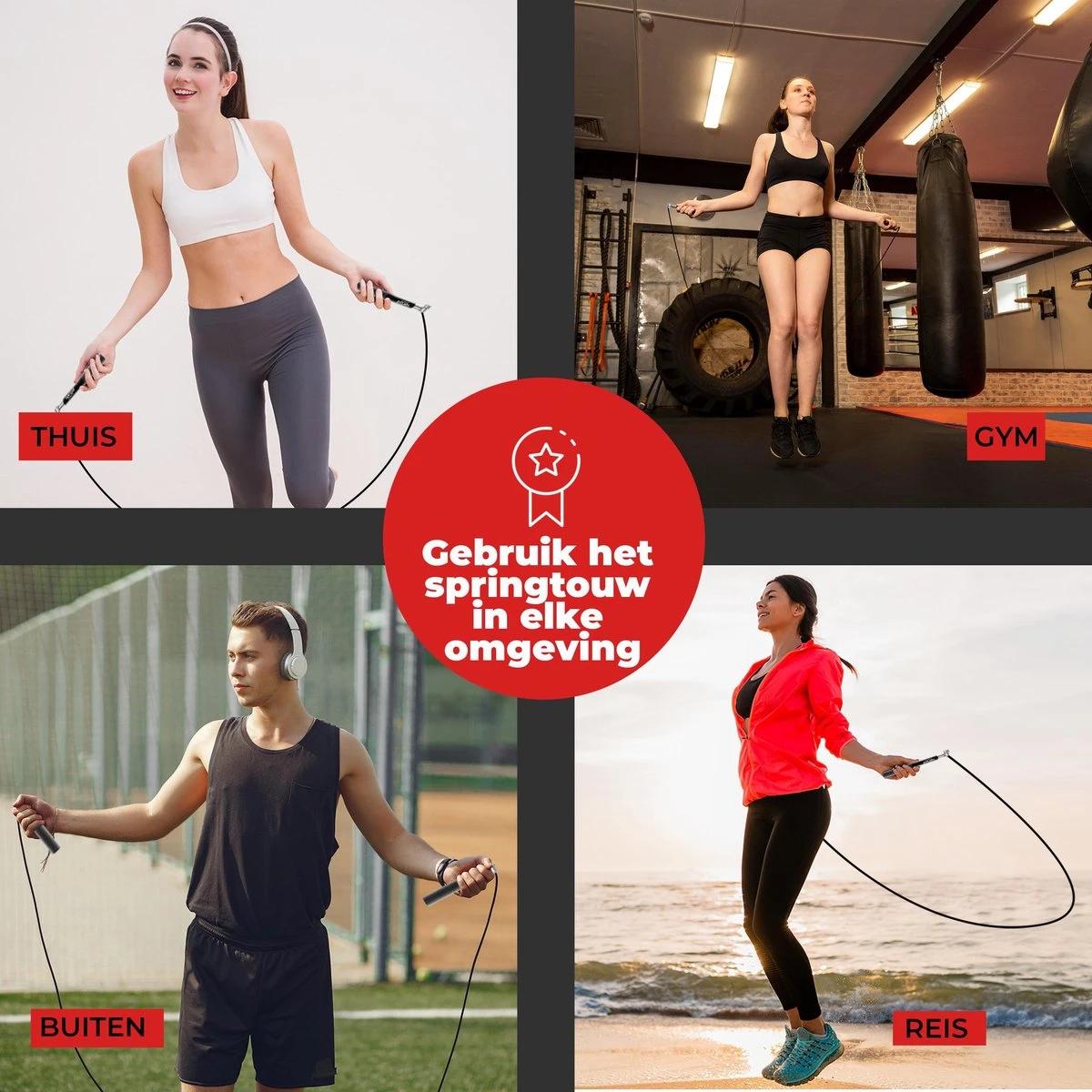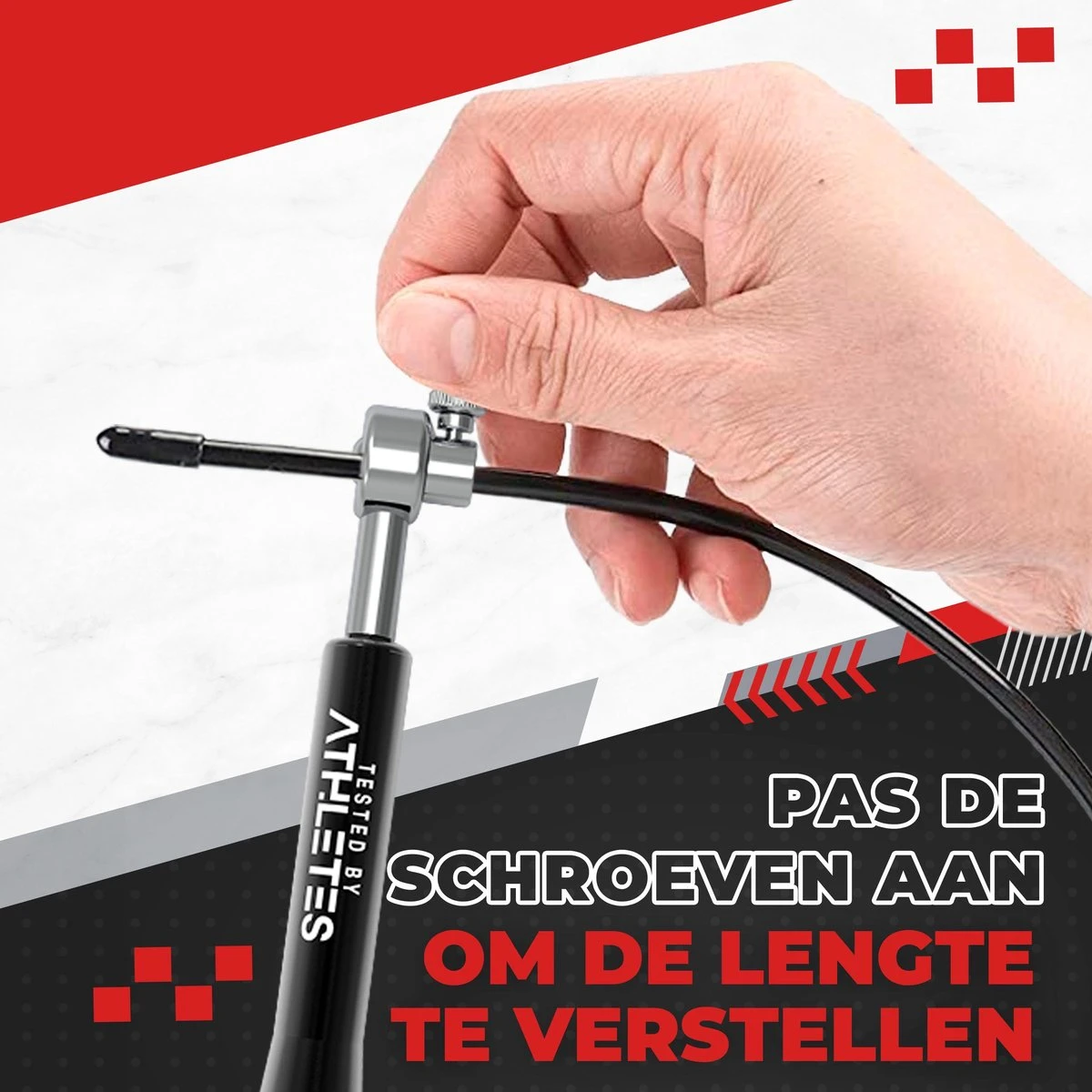 Ben jij graag bezig met jouw gezondheid en conditie? Als jij helemaal gek bent van of net wilt beginnen met sport, dan is dit springtouw de ideale accessoire voor het behalen van jouw sportdoel. Het speedrope springtouw van Tested by Athletes maakt gebruik van een kogellager systeem, waardoor het springtouw soepel en snel ronddraait en het gemakkelijk af te stellen is op lengte. Het sport springtouw is voor iedereen, zo is het ideaal voor een beginner, maar ook voor de professionele sporter. Geniet van de lichte handvaten en de speciaal PU gecoat gevlochten stalendraad, die het springtouw duurzaam maakt. Bestel nu en krijg er een gratis E Book bij en start jouw eerste training!