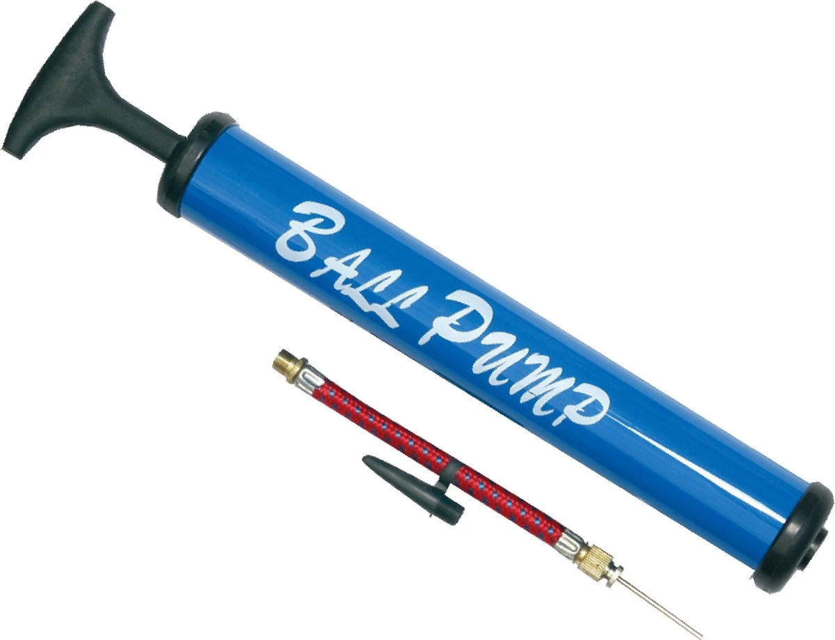 Voetbal ballenpomp met naaldventiel. Deze ballenpomp is voorzien van een flexibele slang, een dunne naald en een dikker opzet stuk voor andere ventielsoorten. Formaat: ca. 30 cm. Materiaal: kunststof.
